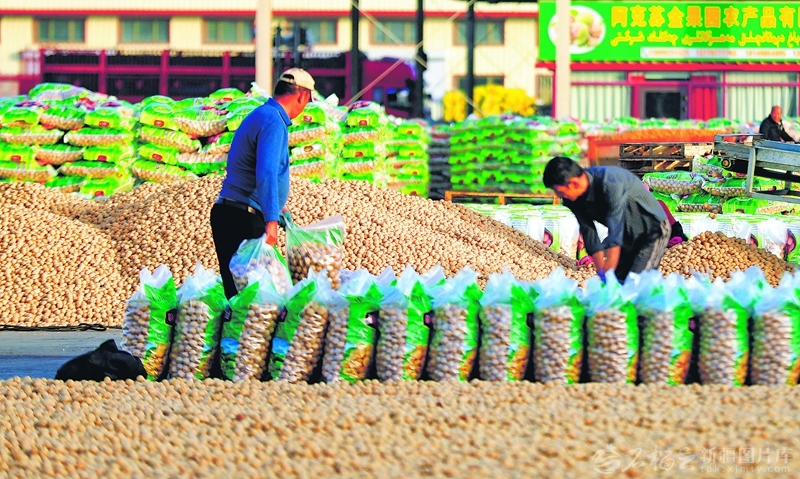 11月3日,工人在新和县核桃交易市场分装核桃。近年来,该县持续打造农特产品种植、加工、销售产业链,将农特产品销往俄罗斯及中亚各国,促进产业发展、农民增收。□魏浩东摄