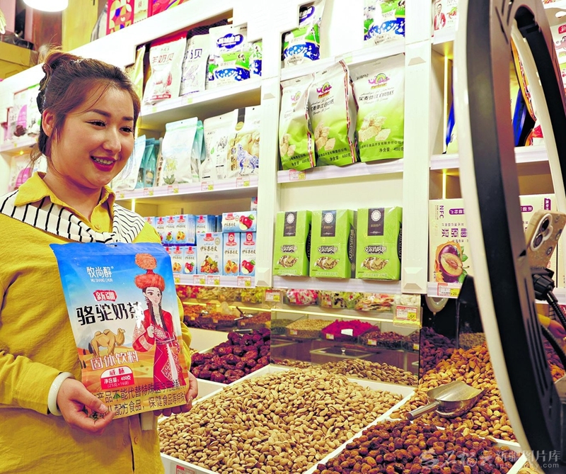 11月3日,库车市乌恰镇甬库振兴村纳巴哈尔农民专业合作社工作人员直播销售特色农产品。该合作社成立于2016年,年销售各类农产品200万元以上。□刘鼎摄