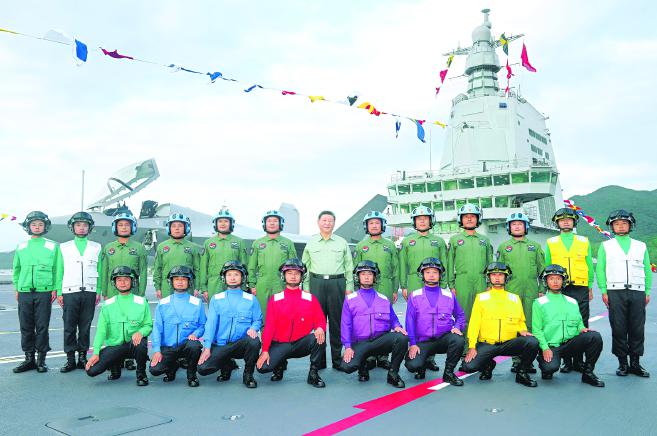 11月5日,我国第一艘电磁弹射型航空母舰福建舰入列授旗仪式在海南三亚某军港举行。中共中央总书记、国家主席、中央军委主席习近平出席入列授旗仪式并登舰视察。这是习近平同舰载机飞行员、航空保障人员合影留念。□新华社记者李刚摄