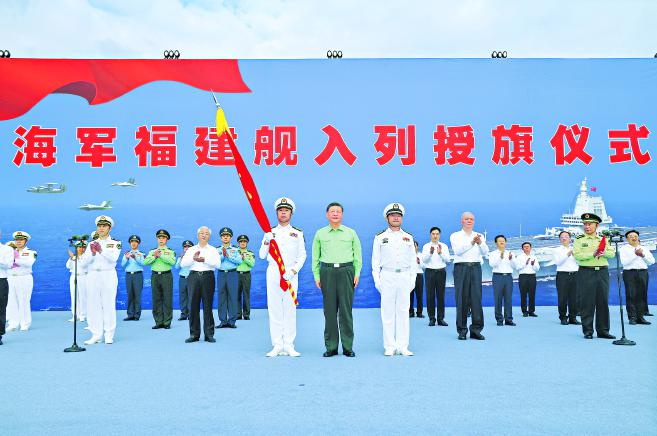 新华社三亚11月7日电(记者梅常伟)我国第一艘电磁弹射型航空母舰福建舰入列授旗仪式5日在海南三亚某军港举行。中共中央总书记、国家主席、中央军委主席习近平出席入列授旗仪式并登舰视察。