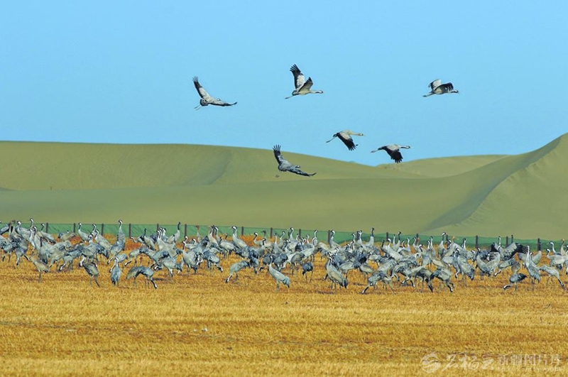 “去年第一次见到灰鹤在这里过冬感觉很稀奇,没想到今年它们又来了。”当地观鸟爱好者石凌云说,3年前,随着油莎豆、冬小麦等作物陆续在这里种植,灰鹤等鸟儿也随之而来,冬日沉寂的荒漠变得生机盎然。