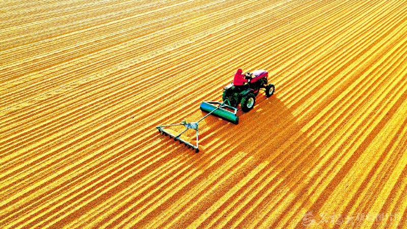11月7日,新疆生产建设兵团第二师29团晾晒场上,一位农民驾驶农机翻晒玉米。连日来,当地农民利用晴好天气,忙着晾晒农作物,确保颗粒归仓。 □杜炳勋摄