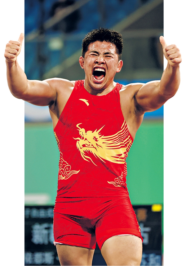 11月12日,新疆队选手阿依都斯·哈得在赛后庆祝胜利。最终,他获得季军。当日,第十五届全国运动会摔跤男子自由式86公斤级比赛在广东清远举行。