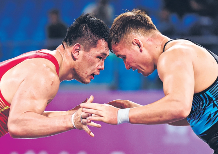 11月13日,新疆队选手阿力木拉提·达拉吾拜(右)在比赛中。□新华社记者李然摄 扫码看视频 本报清远11月13日讯 石榴云/新疆日报记者王晶晶报道:11月13日,在广东清远举行的第十五届全运会男子自由式摔跤和古典式摔跤多个公斤级的比赛中,新疆摔跤队又获两枚银牌。 当日,新疆队选手阿力木拉提·达拉吾拜在男子古典式摔跤97公斤级比赛中获银牌,巴合江·哈力山获得男子古典式摔跤77公斤级银牌。 在本届全运会竞技项目中,新疆摔跤队共获得4枚银牌、4枚铜牌。