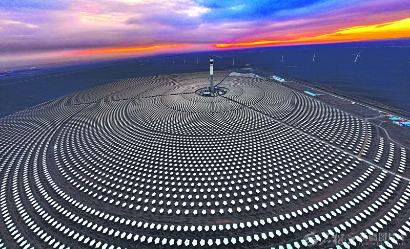 俯瞰位于伊吾县淖毛湖镇的中国能建哈密熔盐塔式5万千瓦光热发电站(11月10日无人机摄)。该电站设计年均发电量约2亿千瓦时,可满足6.19万户家庭全年用电需求,每年可减少二氧化碳排放15.48万吨。 □马新亮摄