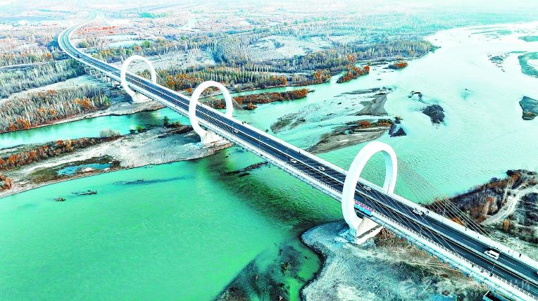 11月15日,车辆在伊犁河三桥上行驶。该桥是国内首座三塔四跨“O”形矮塔斜拉桥,11月11日正式通车。通车后,两岸车程从1小时缩短至5分钟。□张庆华摄