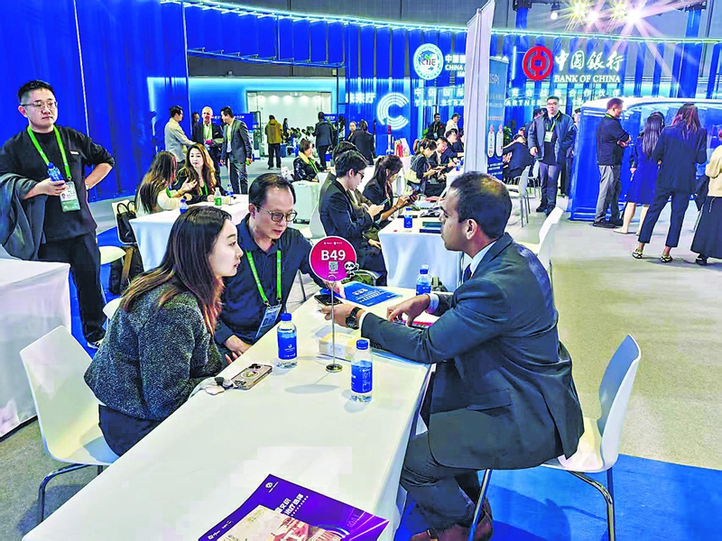 11月6日,中行新疆分行服务团队在进博会现场为参展企业磋商洽谈提供服务。