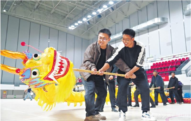 11月21日,在沙湾市文旅中心,伽师县舞龙舞狮青年人才为沙湾市民俗技艺爱好者传授舞龙技巧。□杨文秀摄