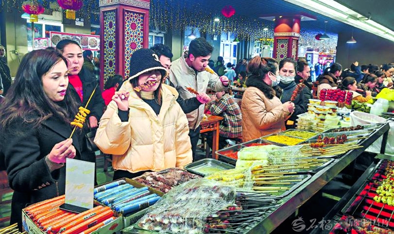 11月21日,食客在策勒县石榴花夜市品尝美食。当日,策勒县首家标准化室内夜市开门迎客,不仅破解了传统露天夜市扰民、季节性经营受限等难题,也在冬日里为当地群众打造了一个温暖舒适的消费新去处。 □玛伊努尔·芒苏尔摄