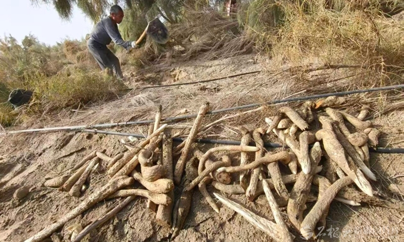 10月23日,任朋辉站在一人多高的梭梭林带里,看着工人从梭梭根部挖出一根根肉苁蓉,脸上绽放出苦尽甘来的喜悦。
