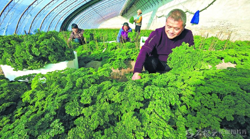11月27日,菜农在察布查尔锡伯自治县察布查尔镇安定村蔬菜专业合作社的温室大棚里采收欧芹。该合作社种植了10余种特色绿叶菜,通过“线上+线下”订单销售方式,供应周边县市及乌鲁木齐等地,年销售额超600万元。□华岩明摄