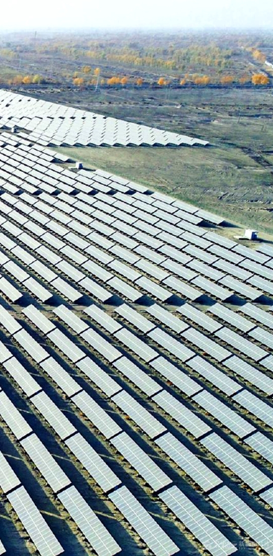 兵团第二师沙漠区域内的光伏发电场一角(11月25日无人机摄)。该电场通过“光伏+草方格+绿植”模式,治理沙化土地超69万亩。 □杜炳勋摄