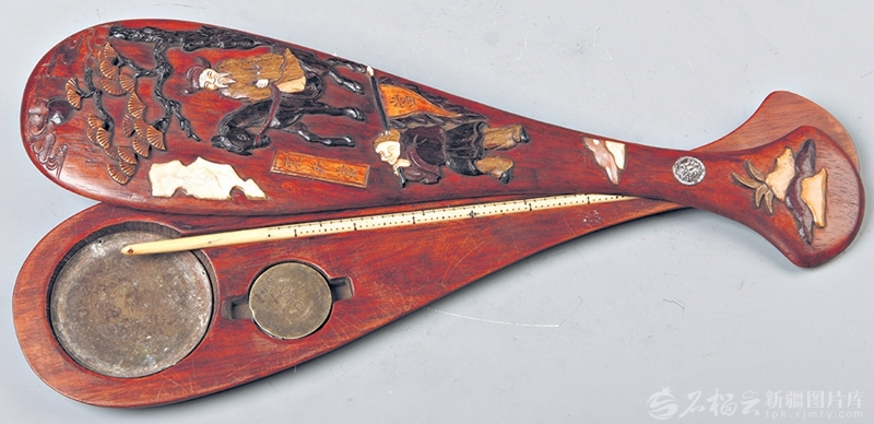 在阿克苏地区博物馆,有一把清代黄花梨戥(děnɡ)子,它的精致优雅令人很难将其和寻常杆秤联系到一起。戥子,是古代用来称量金、银、贵重香料、药材的精密衡器。它的外形像琵琶,盒身用黄花梨木制成,上面用百宝嵌工艺镶嵌着“马上发财”吉祥图案和“东升当”字样。仔细观察,还会发现盒身上的图案纹饰色泽会随着光线流转而变换。