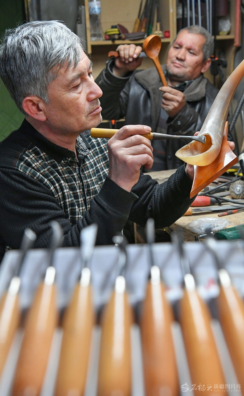 作为木器雕刻技艺第四代传承人,艾尼江15岁便追随叔叔学艺。前些年,他还被附近乡镇中学聘请为代课教师,在职业班开设木雕课程。截至目前,艾尼江已累计为500余名学生和周边村民传授木雕技艺,让这门传统手艺惠及更多群众。