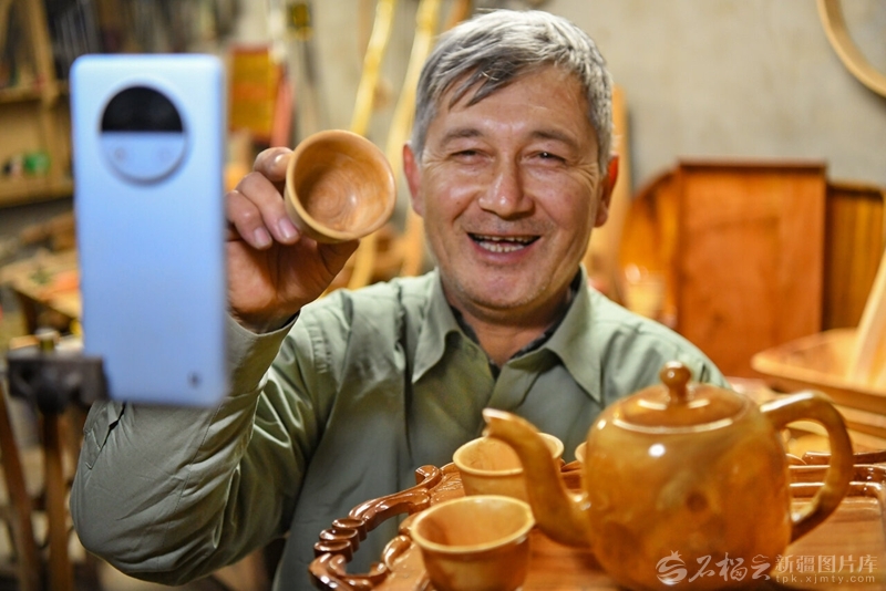 12月1日,艾尼江通过抖音平台介绍自己制作的木雕茶具。
