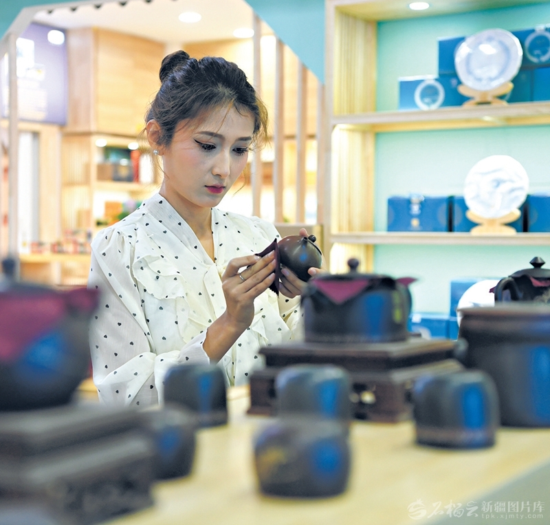 11月30日,夏黑班木在乌鲁木齐市华凌茶城一家茶叶专卖店整理茶具。