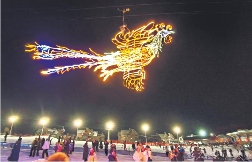 12月5日晚,在丝绸之路山地度假区专属舞台上,演艺人员表演《飞天》。当日,第二十三届乌鲁木齐丝绸之路冰雪风情节“冰雪来BAO 风情之夜”活动举行,成为雪假里一场精彩的文化盛宴。 □石榴云/新疆日报记者李雄心摄