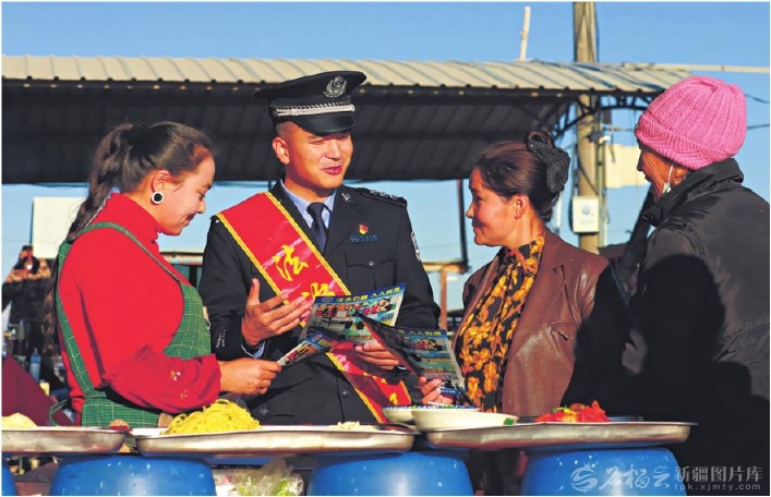 12月1日,民警向商户和群众宣传法律法规知识。 连日来,新疆出入境边防检查总站阿克苏边境管理支队牙满苏边境派出所民警走进当地巴扎,开展2025年全国“宪法宣传周”活动,增强群众的宪法意识。□王举南摄