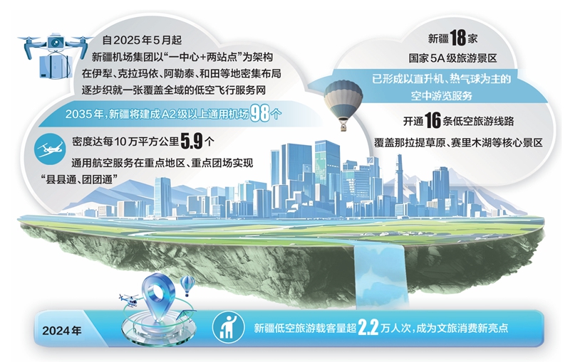 立足辽阔疆域的资源禀赋与丰富场景,新疆低空经济正朝着更智能、更安全、更具活力的方向迈进。《新疆维吾尔自治区文化和旅游产业集群发展规划(2025—2030年)》提出,到2030年,全疆主要景区实现低空旅游飞行常态化,培育百亿元级低空旅游产业。