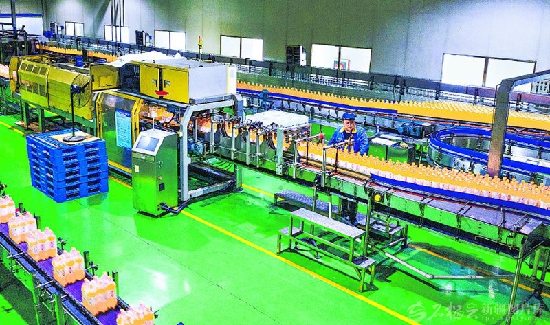 12月10日,在位于五家渠经济技术开发区的新疆宝隆包装技术开发有限公司车间里,全自动生产线高速运转,瓶坯加工、灌装、贴标、喷码等工序一气呵成,一瓶瓶饮料有序下线,即将发往全疆各地商超。 □李华北摄