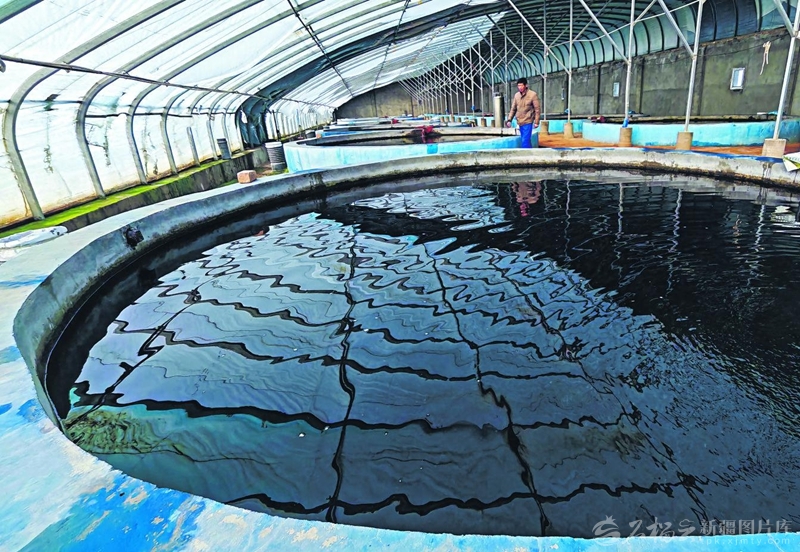 12月5日,吐鲁番市鄯善县连木沁镇连木沁巴扎村什泉冷水鱼养殖基地,工作人员查看鱼苗生长情况。如今,坎儿井井水除了农业灌溉,还为现代养殖业提供了源源不断的活水。