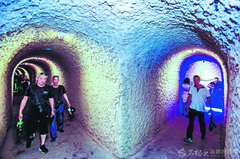游客在吐鲁番坎儿井乐园景区地下通道参观(2023年6月20日摄)。截至11月,该景区2025年接待游客超40万人次。