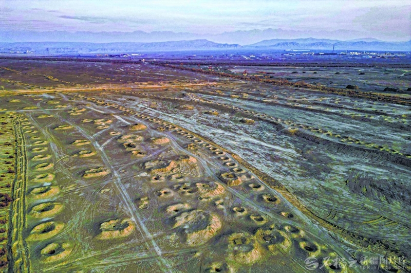 俯瞰吐鲁番市东部戈壁滩上的坎儿井竖井井口(12月3日摄)。目前,吐鲁番市共有坎儿井1108条。