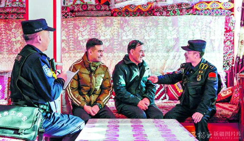 12月11日,民警与群众交谈。当日,新疆出入境边防检查总站喀什边境管理支队塔什库尔干边境派出所开展“冬季暖阳”行动,民警深入辖区群众家中走访,了解所需所盼,宣讲法律法规,全力守护辖区安全稳定。□王九峰摄