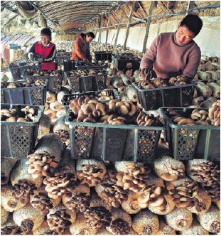 12月15日,察布查尔锡伯自治县良繁场新良蔬菜专业合作社社员在大棚内采收平菇。近年来,该县创新探索“采摘+观光”融合发展模式,食用菌种植产业已成为当地群众增收致富的特色支柱产业。 □华岩明摄