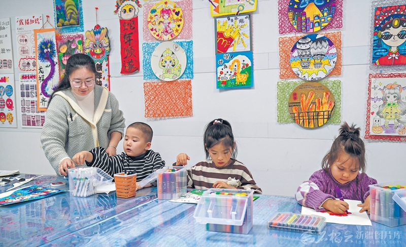 近日,在乌苏市新市区街道文德路社区党群服务中心,志愿者和孩子们一起制作手工、绘画。今年,乌苏市各社区书屋延长开放服务时间,并招募志愿者为孩子们开展作业辅导、读书、手工制作等活动,减轻家长负担。 □李仁锡摄