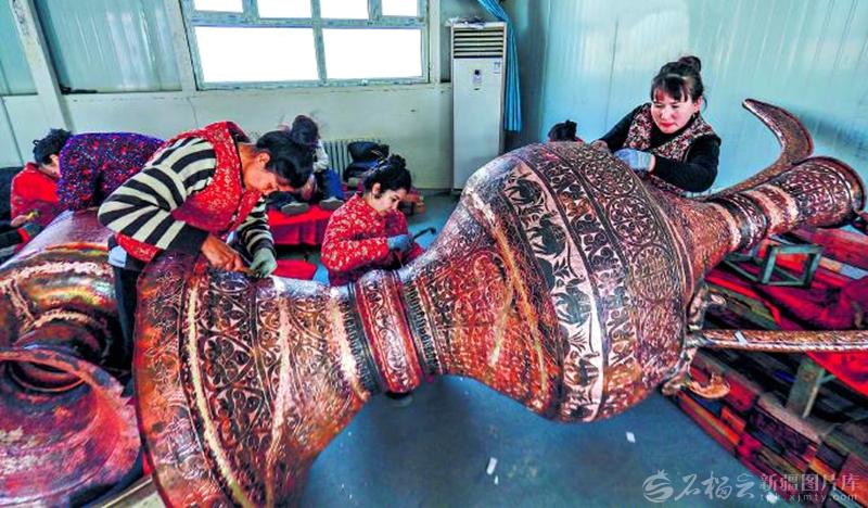 12月15日,位于洛浦县恰尔巴格镇加依托格拉克村的洛浦县传家宝手工艺品专业合作社内,员工在大型铜器上雕刻图案。该合作社目前可生产铜器手工艺品40余类,月销售额3万元左右,产品畅销疆内外市场。 □买买提艾力·艾尼瓦尔摄