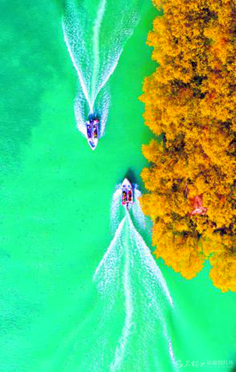 游客乘坐快艇在泽普县金湖杨景区游览(10月25日摄)。从空中俯瞰,湛蓝的湖水与金色的胡杨交相辉映,美不胜收。□张昀摄
