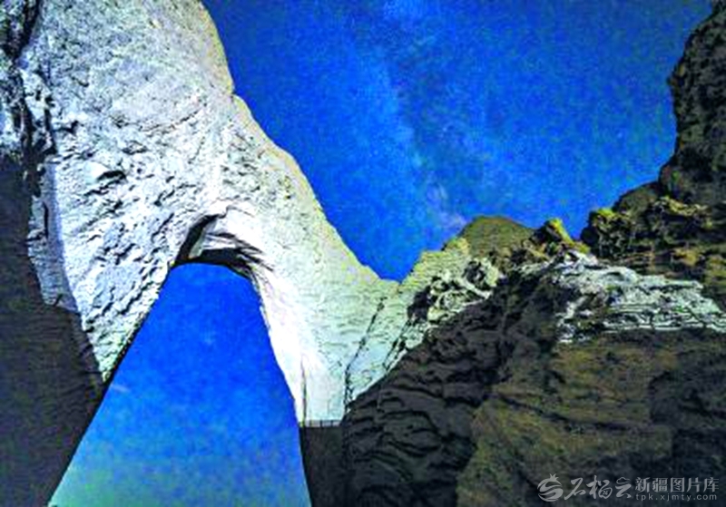 阿图什天门景区上空,银河倾泻而下,与天然石拱门完美交融,构成一幅天地共谱的星河画卷(8月22日摄)。 □谢智摄