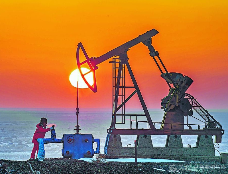 12月16日,中国石油新疆油田分公司重油开发公司金龙区块生产现场,太阳从地平线缓缓升起,犹如挂在采油机上的灯笼。 □徐志远摄