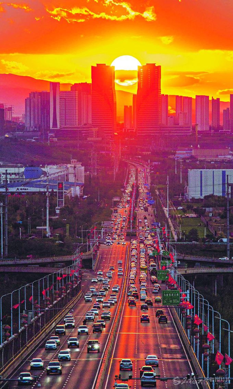 乌鲁木齐经济技术开发区(头屯河区)万盛大街因绝美落日景观走红网络,被网友亲切地称为“落日大道”(9月21日摄)。 □李玉德摄
