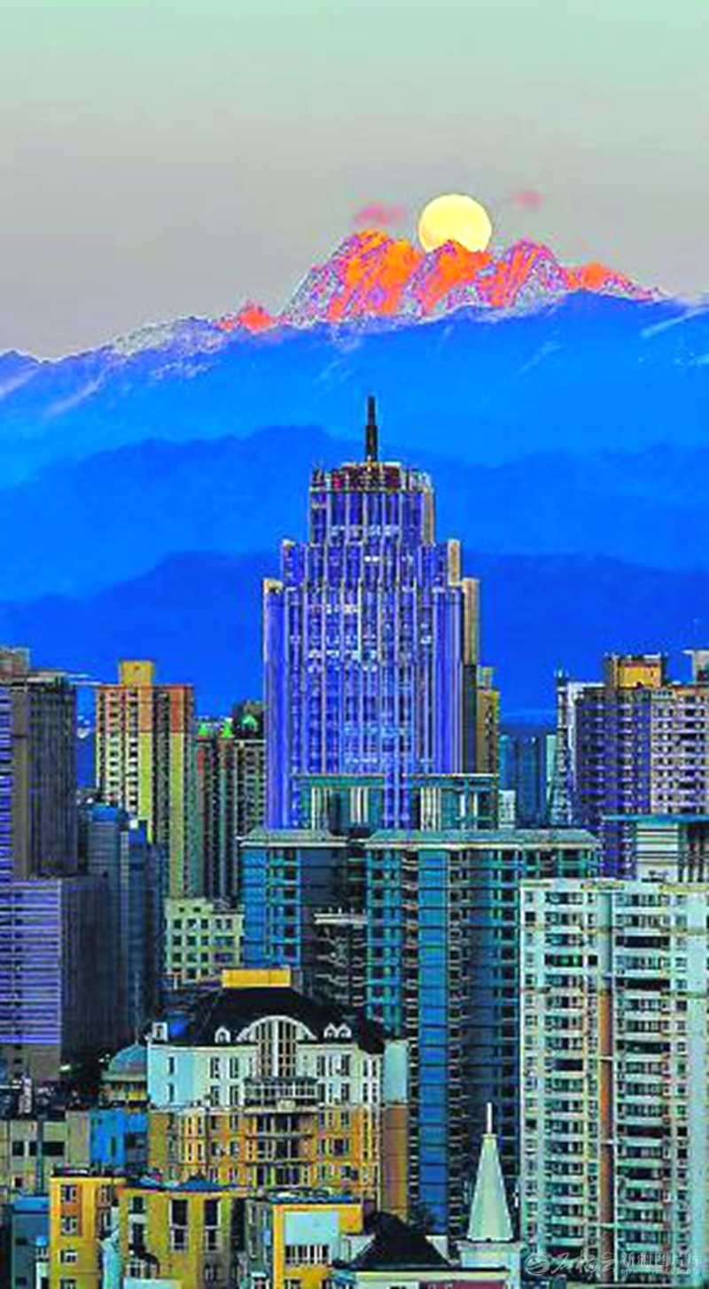 夕阳还停留在博格达峰时,一轮明月缓缓升起。构成一幅明月出天山的壮美画卷(10月6日摄)。
