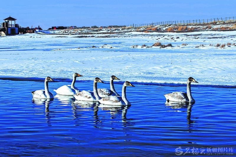 12月17日,巴里坤哈萨克自治县高家湖湿地景区,天鹅在水中游弋。