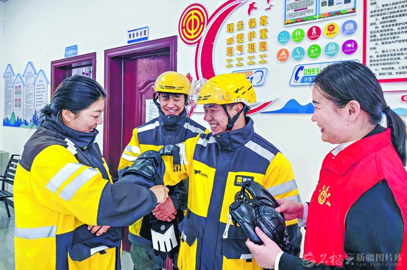 12月17日,志愿者为外卖骑手送上手套、护膝。连日来,沙湾市积极开展“新就业形态劳动者温暖服务季”活动,为外卖骑手、家政服务员等群体赠送暖心物品,让关爱直达基层一线。□卞婷摄