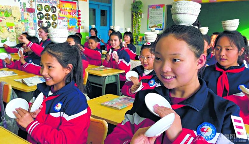 12月18日,洛浦县第四小学学生在课间活动上跳顶碗盘子舞。