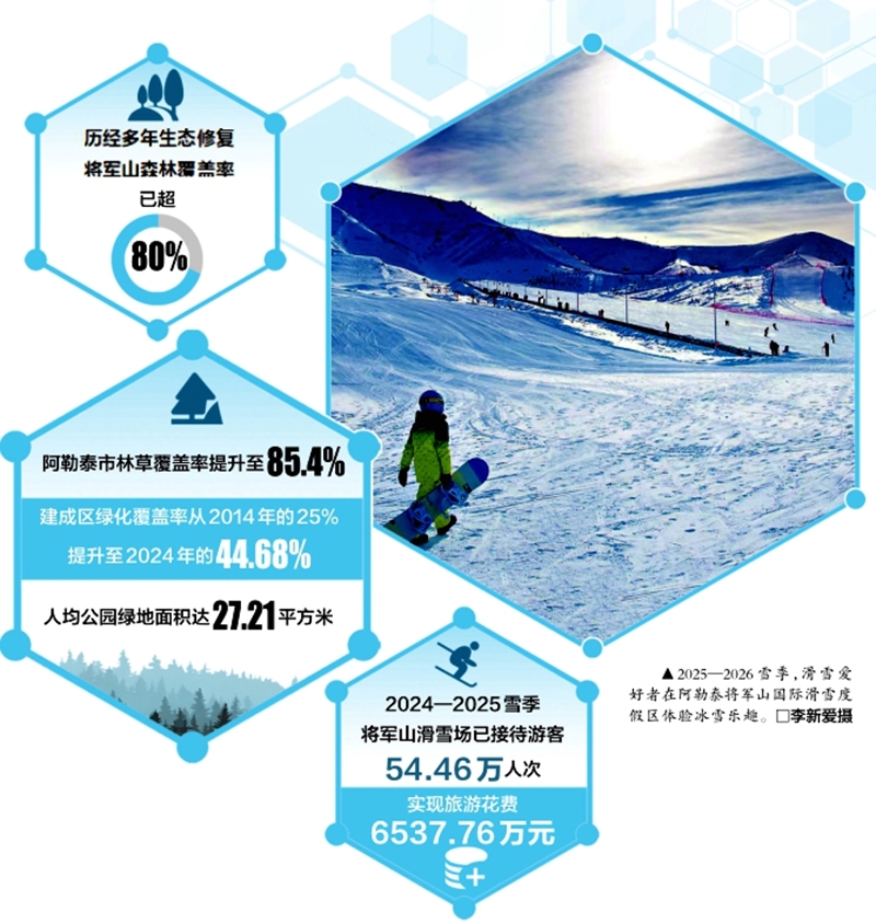 改变,从2009年将军山滑雪场动工开始。施工队坚持雪道绕树而修、缆车顺山而建,最大限度保留原生植被。2018年,阿勒泰市在将军山北面启动荒山绿化工程,干部职工、牧民群众扛着树苗上山,在石头缝里挖坑,用牲畜驮水灌溉。云杉、樟子松扎下根,沙棘、草木樨铺满地,曾经的荒山渐渐披上绿装。
