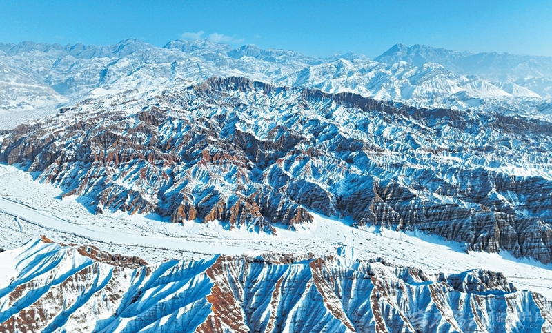 12月25日,火焰山银装素裹,冰与火奇景蔚为壮观。火焰山横卧于吐鲁番盆地,盛夏酷热似火,冬季披上“银装”后,景色独特迷人。 □刘健摄