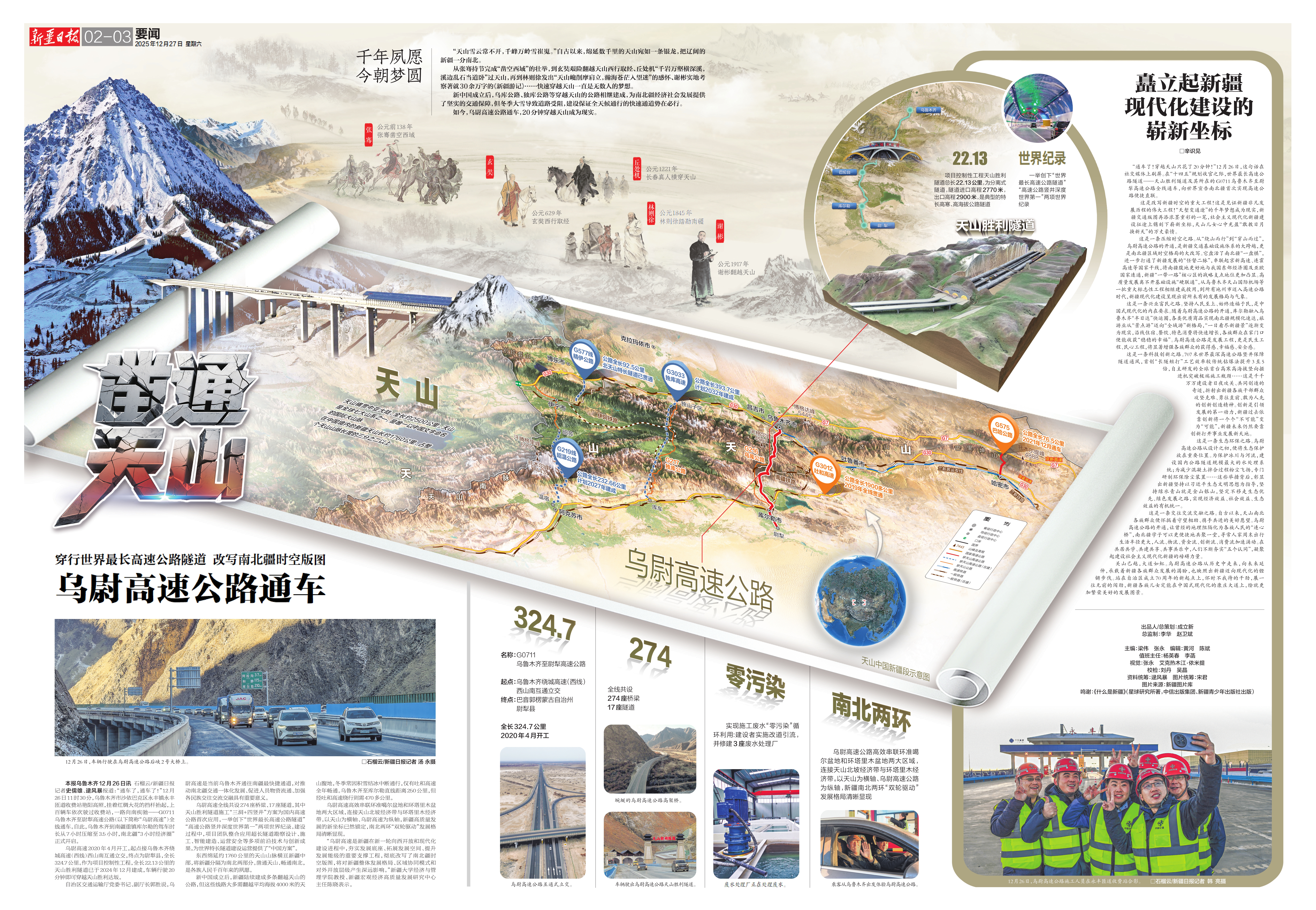 从张骞持节完成“凿空西域”的壮举,到玄奘艰险翻越天山西行取经、丘处机“千岩万壑横深溪,溪边乱石当道卧”过天山,再到林则徐发出“天山巉削摩肩立,瀚海苍茫入望迷”的感怀、谢彬实地考察著就30余万字的《新疆游记》……快速穿越天山一直是无数人的梦想。