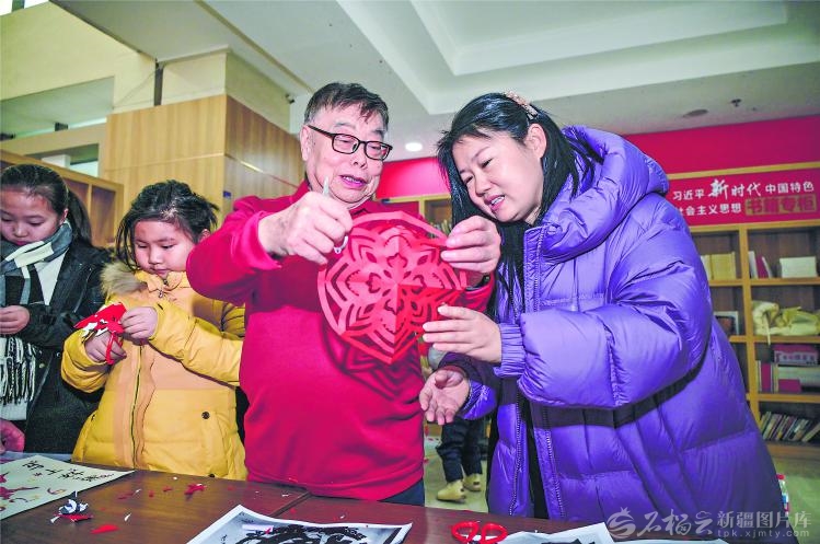 2026年1月1日,在呼图壁县新时代文明实践中心,群众在志愿者指导下体验剪纸技艺。当日,“文明相伴辞旧岁 邻里同心贺新年”活动在这里举办,通过剪纸、写春联等形式,为各族群众送上新年祝福。 □陶维明摄
