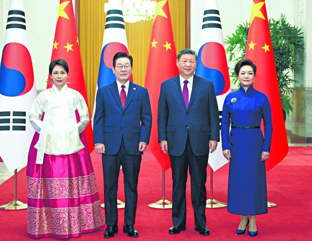 1月5日下午,国家主席习近平在北京人民大会堂同来华进行国事访问的韩国总统李在明举行会谈。这是会谈前,习近平和夫人彭丽媛同李在明和夫人金惠景合影。 □新华社记者谢环驰摄