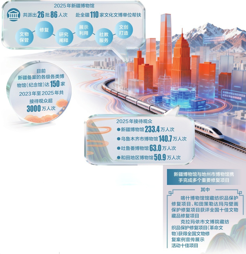 “帮助全疆各地博物馆从文物保管、修复、研究阐释、展示利用、社教服务及文创打造等多方面提质升级,凸显其在现代公共文化服务体系中的重要价值,是我们开展基层帮扶工作的目的。”新疆博物馆党委书记何嘉说,2025年新疆博物馆共派出26批86人次,赴全疆110家文化文博单位开展帮扶。