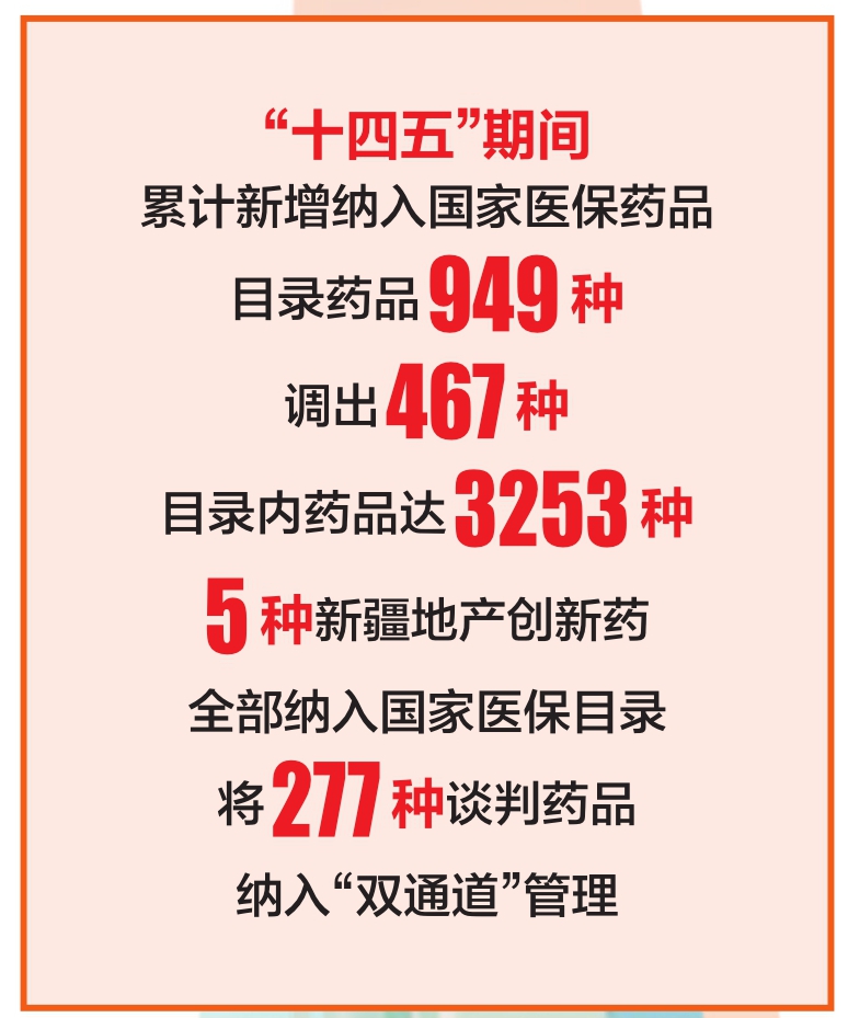 支付方式改革纵深推进,全面推行以按病种付费(DRG/DIP)为主的多元复合式改革,实现所有统筹地区、符合条件的定点医疗机构全覆盖;发布按病种付费方案2.0版,完善特例单议、预付金等配套机制,引导医疗机构从规模扩张向内涵式发展转型,全区平均病例组合指数显著提升,次均住院费用稳中有降。药品目录管理科学规范,严格落实国家医保药品目录,“十四五”期间累计新增纳入949种药品、调出467种,目录内药品达3253种;5种新疆地产创新药全部纳入国家医保目录,将277种谈判药品纳入“双通道”管理,上线医保药品云平台方便群众找药比价。