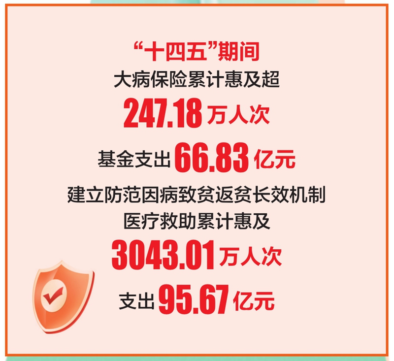 慢性病保障网持续织密,规范全区门诊慢特病保障制度,强化“两病”门诊用药专项保障,“十四五”以来惠及2598.27万人次,医保基金报销12.59亿元,政策范围内报销比例达59.75%。重特大疾病保障再加力,“十四五”期间大病保险累计惠及超247.18万人次、基金支出66.83亿元;建立防范因病致贫返贫长效机制,医疗救助累计惠及3043.01万人次、支出95.67亿元,农村困难群众住院政策范围内费用报销比例稳定在90%以上。生育保障水平稳步提升,“十四五”末生育保险参保人数达376.40万人。长期护理保险试点有序推进,乌鲁木齐市、昌吉回族自治州等覆盖336.74万人,累计3.09万名失能群众享受待遇3.72亿元。引导发展“惠民保”,阿克苏地区、乌鲁木齐市先行先试,累计参保231.13万人次,赔付1.29亿元,与基本医保形成有效互补。
