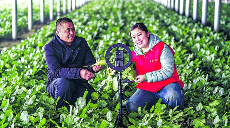 1月11日,党员干部在乌苏市夹河子乡夹河子村帮助农户直播售卖萝卜。连日来,乌苏市开展助农冬收活动,组织党员干部深入田间地头,助力农产品销售。 □李仁锡摄