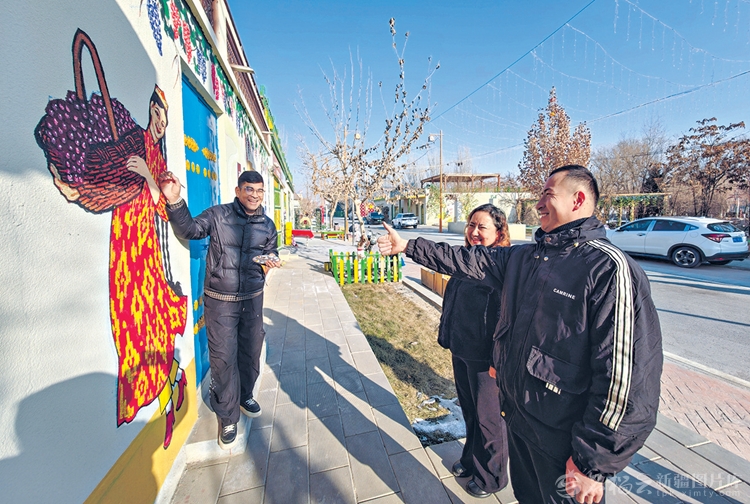 1月14日,在阿瓦提县阿瓦提镇博斯坦社区,乃比江·阿布都热合曼(左一)与社区居民交流。