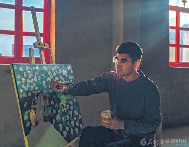 儿时,母亲用灶膛余炭画出的鸟兽花纹,是乃比江与绘画的初遇。那份质朴而生动的美感,成为他投身刀郎农民画创作的初心。2015年,他拜县里的多位农民画家为师,从线条勾勒、色彩搭配学起,跟着老师深入田间地头,把翻滚的麦浪、飘香的瓜果与村民欢歌的场景,都融进浓烈饱满的画面里。